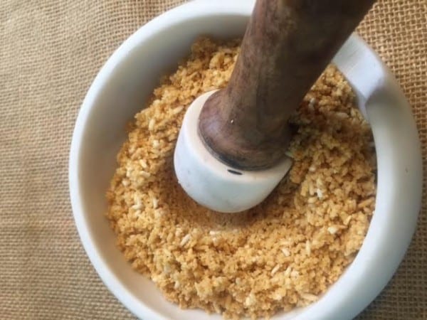 - When ready to cook, toast the uncooked rice grains in a small skillet over medium heat for 5 to 6 minutes. Do not leave this unattended or it will burn. Toss the grains around with a turner.When the rice grains turn brown and are fragrant, remove from the stove top and let it cool.Place the toasted rice and peanuts in a food processor or blender. Process for 1 minute till crushed and combined. Set aside.