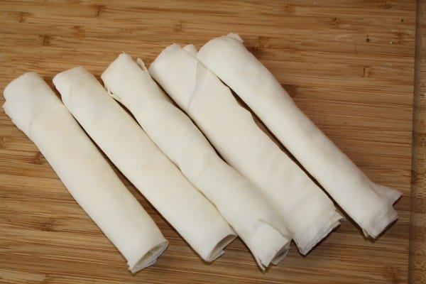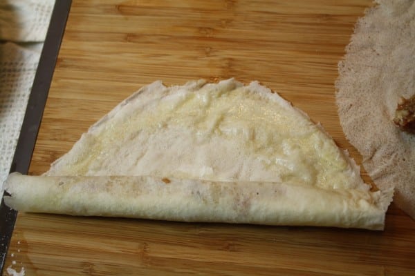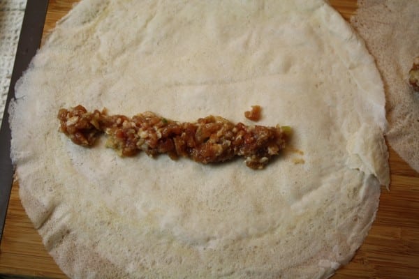- Roll the meat-filled wrapper, starting with the edge closest to you. Roll it away from you, shaped like a thin cigar. Tuck in the left and right edges, and keep rolling. Seal the edges with egg wash (combine one whole beaten egg and 1/4 cup water).
