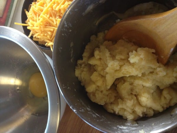 - Transfer the dough to a bowl. Allow to cool for 1 to 2 minutes. Using a mixer, beat the eggs into the dough, one at a time. Beat well. Add the shredded cheddar cheese and pinch of pepper.