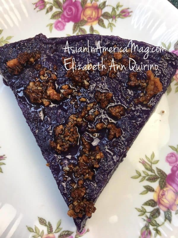 Kalamay Ube is a classic Filipino kakanin (rice cake) whose main ingredient is ube (purple yam). My version used frozen cooked ube from the Asian markets. I added rice flour, canned coconut milk and condensed milk to the mixture to thicken it. The process of making this involves constant stirring on the stove-top. When it's ready, the sweet flavors of ube combined with fragrant coconut define this luscious treat for dessert or a merienda snack. This is an Asian in America recipe by Elizabeth Ann Quirino. Serves 4 to 6.