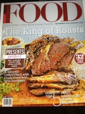 First, be sure to grab a copy of this holiday issue FOOD Magazine December 2012. I’m a contributing writer for FOOD Magazine, the largest circulated culinary magazine in Manila. I interviewed Marvin Gapultos for a feature article and he generously shared his holiday recipes, told us stories about how his family celebrates a Filipino-American holiday season. Published by ABS-CBN Publishing Inc., find FOOD Magazine in Manila news stands or online at www.Zinio.com (an online news stand).